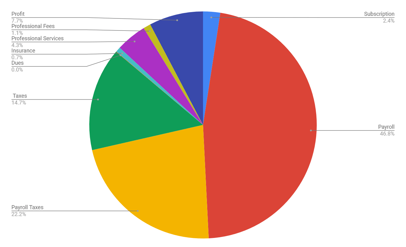 If you bill by the hour, you have very little profit. See that number? 7.7% profit. That means that billing is essentially a treadmill that I can’t get off of until that number goes higher. The profit number lets you invest time into improving your craft and your business. If that number stays low, it’s hard to work on your business because you’re working in your business. I don’t know what that number should be, but I assume at least 30%. I do know that 7.7% means that I spend more time spending time to solve problems I have than I can spend money to solve my problems. That “Professional Services” percentage? That’s how much I spent on business coaching/consultants last year to help me build my business. That number is shockingly close to the profit number, percentage wise.
